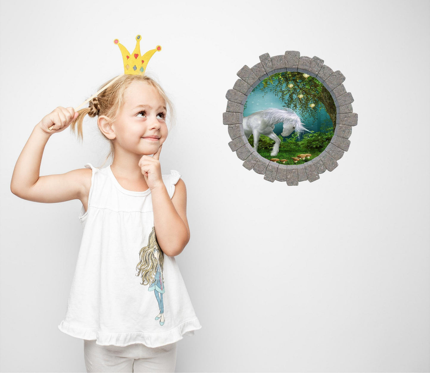 Enter the magical world of wonderland with our fantasy/fairy tale inspired "Unicorn In Enchanted Forest" Stone 3D Hole Keyhole Wall Decal. Create the picture perfect Disney inspired whimsical wonderland themed room. We make our wall decals easy to apply, eco-sol safe and removable. Just peel and stick this fabric to your little one's bedroom, playroom or nursery walls. Perfect for any fantasy/princess themed occasion: Kids birthday party decorations, bridal shower decorations, themed kids bedrooms, crafts, etc.