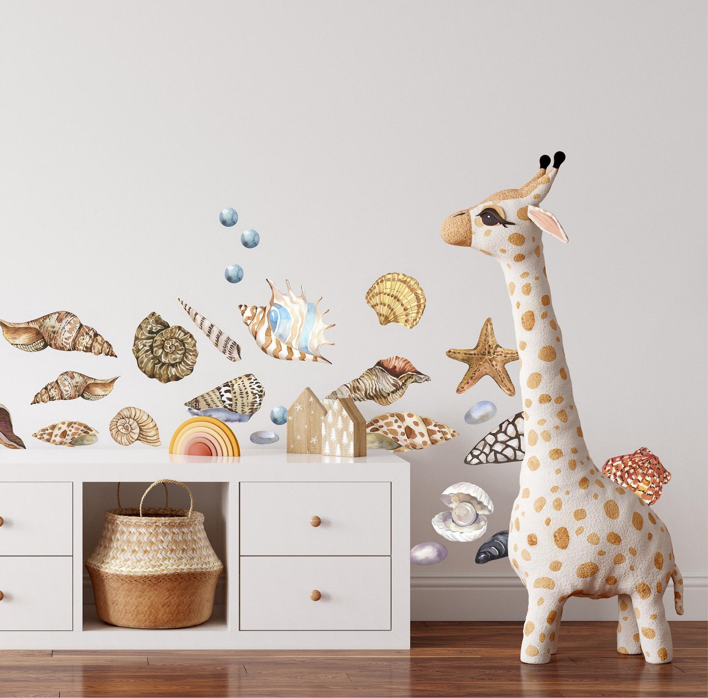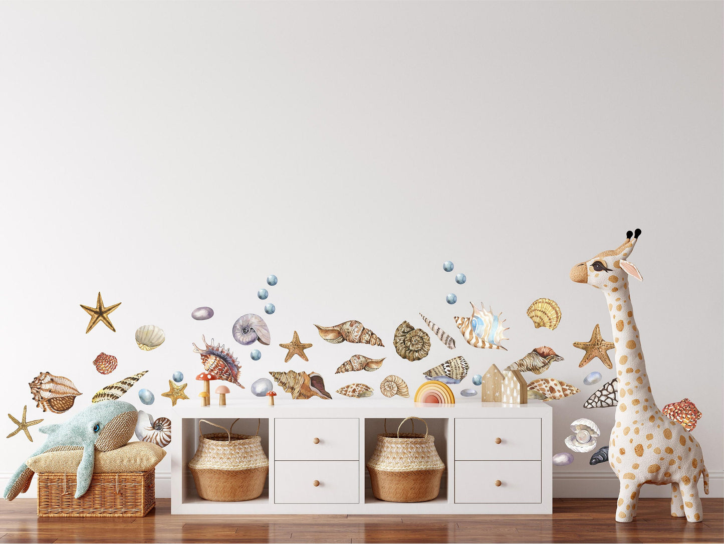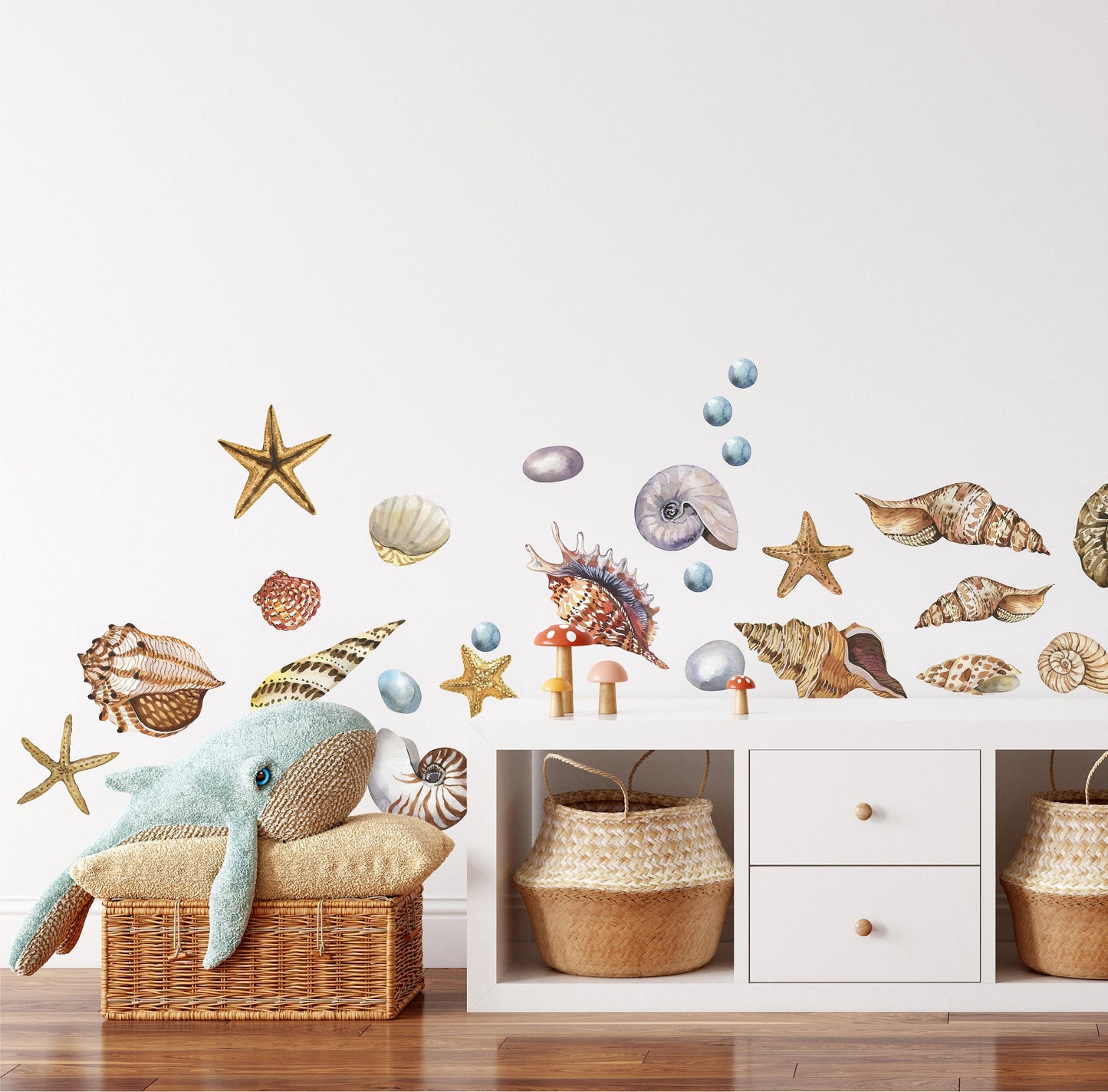 This adorable Watercolor Beach Seashells Set Wall Decal Set repositionable fabric wall sticker will transform any room into a whimsical ocean oasis. Illustrate your nursery or playroom with this sweet watercolor marine seashell & starfish set today!